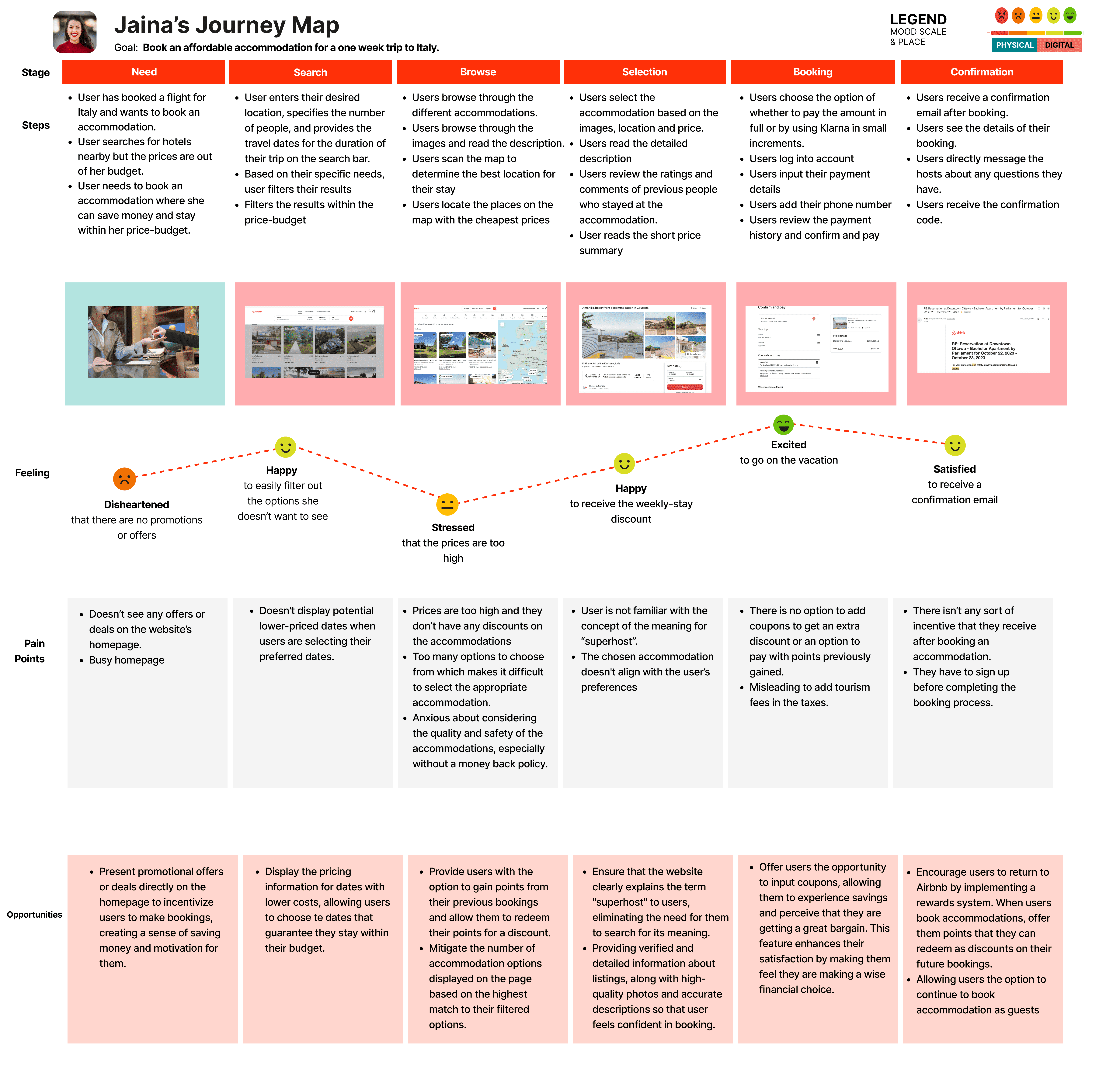 After crafting our user persona, we created a journey map to find out the pain points of Airbnb and the expectations that users would have for a loyalty program.