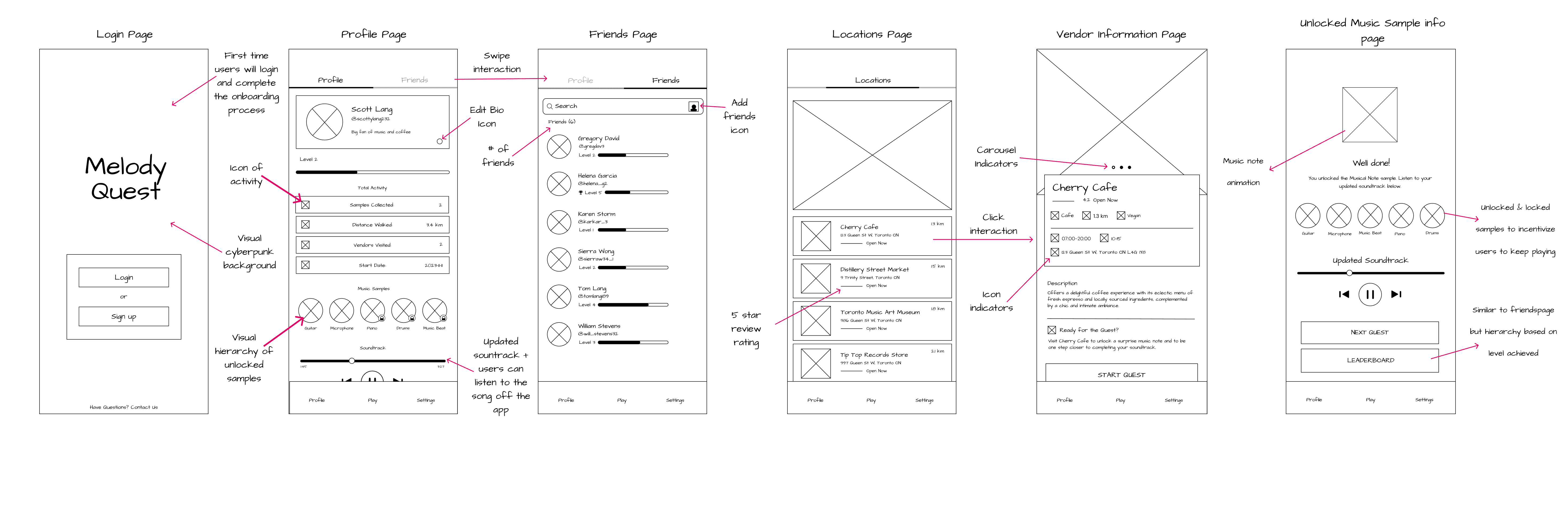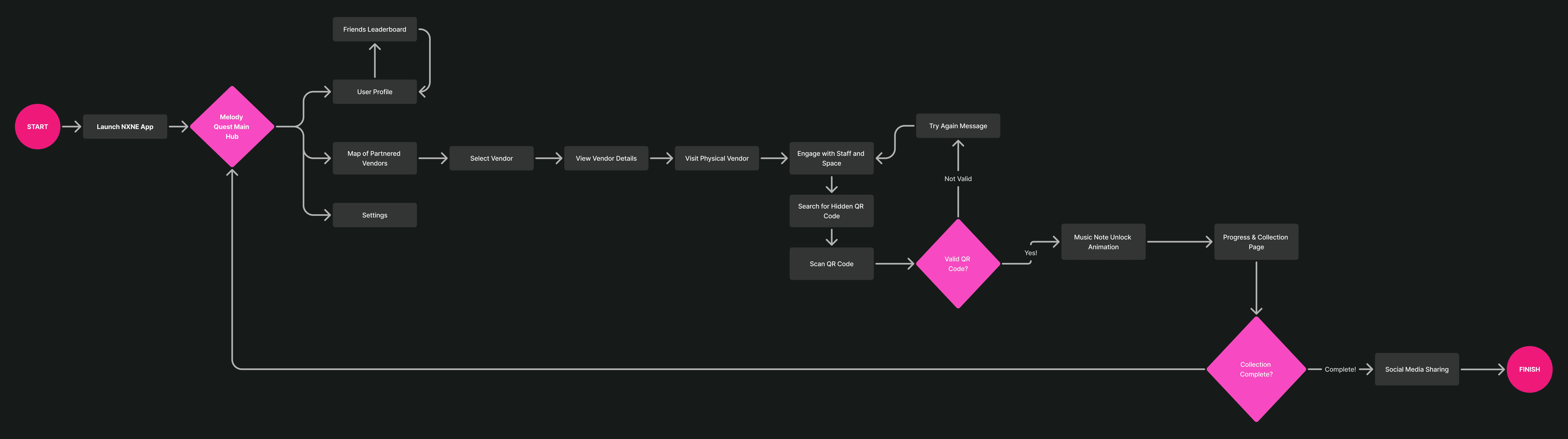 To enhance the NXNE experience, our vision was to create an interactive, gamified experience that encourages attendees to explore vendor spaces, engage with the NXNE app, and discover new artists and local businesses. Our team invisioned a game in which users will have to collect music samples (bass, vocals, drums, keys, chords) by scanning QR codes from different local vendors to complete a mystery soundtrack. Through immersive challenges, rewards, and real-time app integration, we aim to drive foot traffic, foster community interaction, and elevate the festival atmosphere, all while enriching the enjoyment of music and culture.